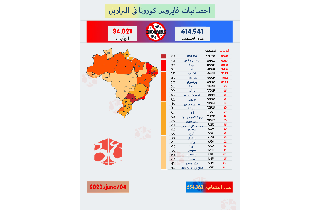 سجلت وزارة الصحة البرازيلية نحو 30925 إصابة جديدة بفيروس كورونا المستجد اليوم 4 يونيو/ حزيران الجاري