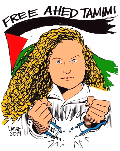 كاريكاتير للرسام البرازيلي كارلوس لطوف في تفاعله مع قضية الطفلة الفلسطينية الأسيرة عهد التميمي التي اعتقلتها قوات الاحتلال "الإسرائيلي" التي تنتهك يومياً حقوق الأطفال والقانون الدولي.