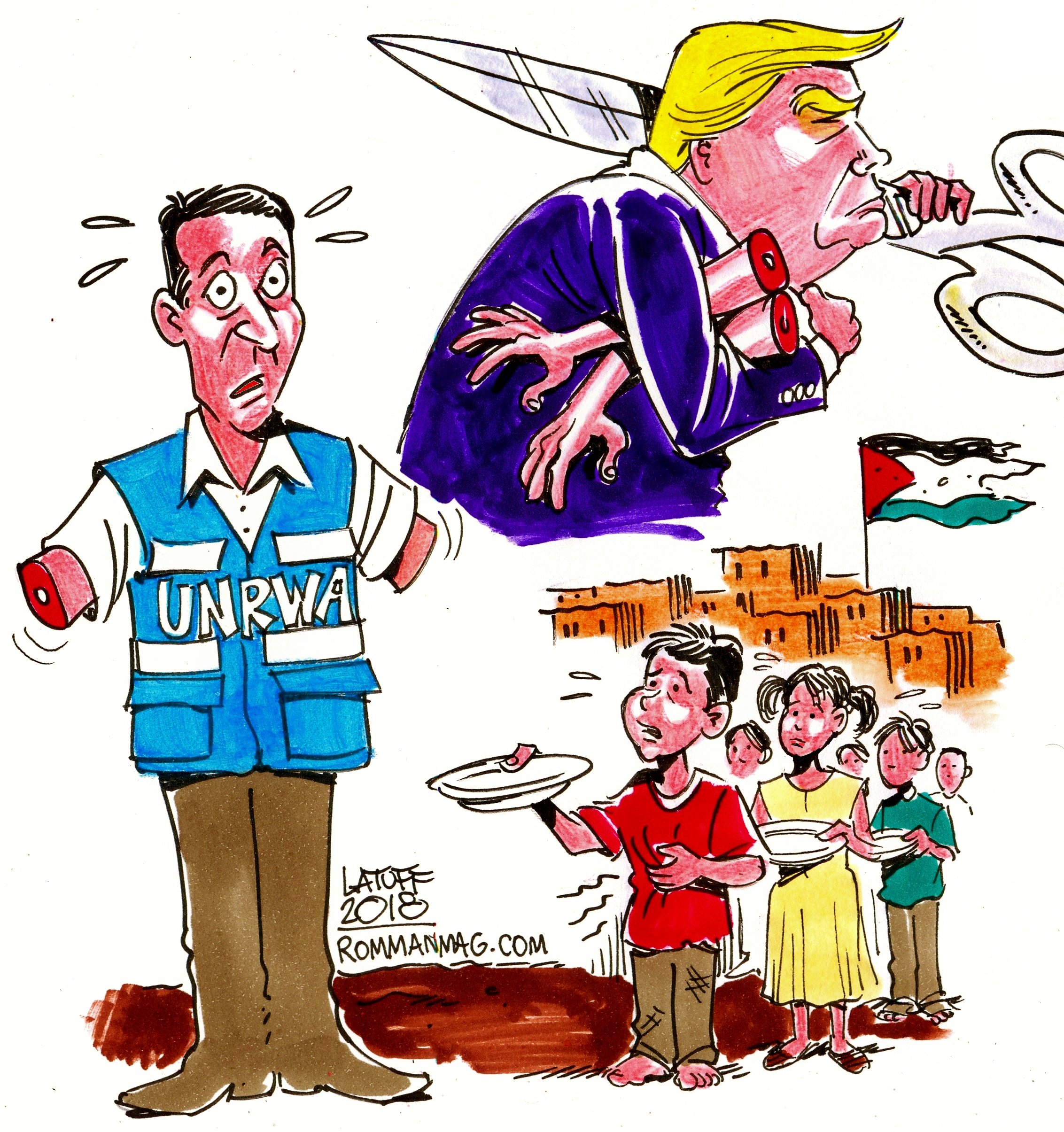 كاريكاتير للرسام البرازيلي كارلوس لطوف حول قرار إدارة الرئيس ترامب بقطع المساعدات عن الأونروا