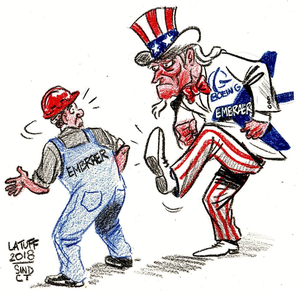 كاريكاتير للرسام البرازيلي كارلوس لطوف حول الحديث عن شراء شركة "إمبراير" البرازيلية لصناعة الطائرات من قبل شركة "بوينغ"