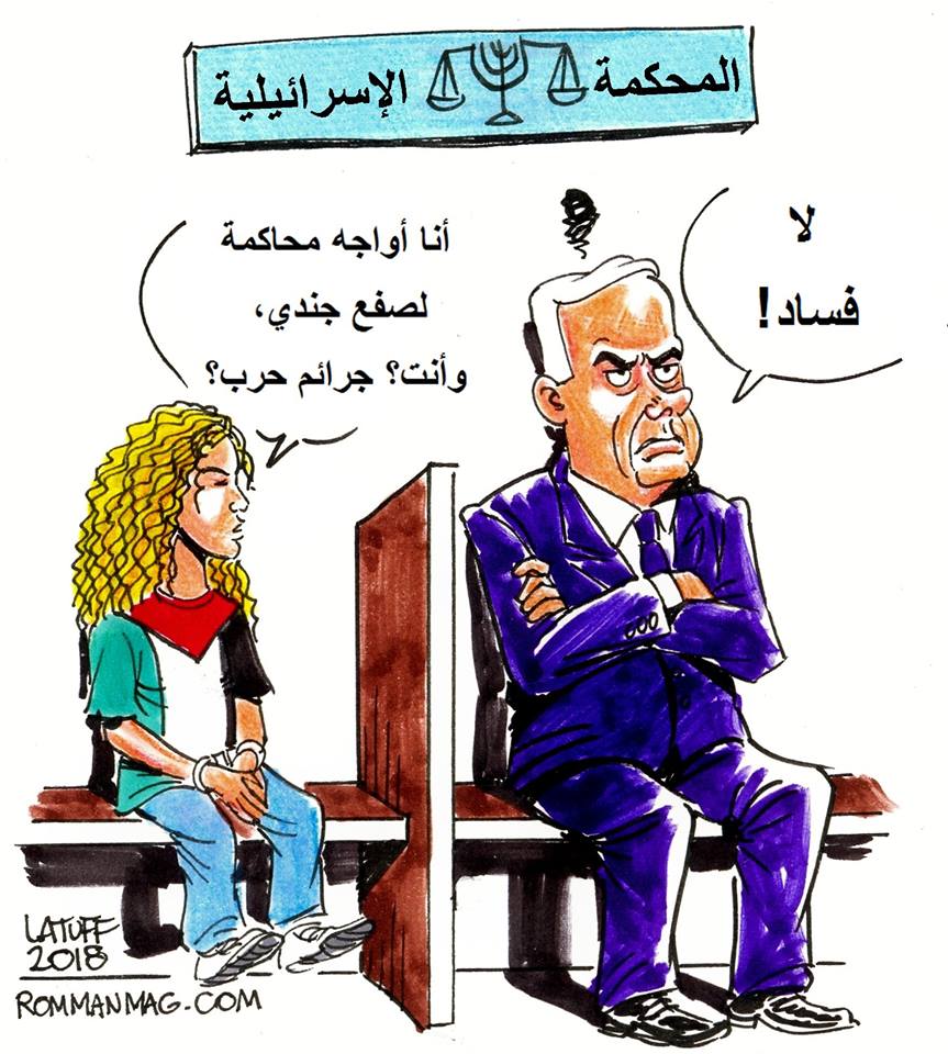 كاريكاتير للرسام البرازيلي كارلوس لطوف يسخر من محاكمة مجرم الحرب "الإسرائيلي" بنيامين نتنياهو بقضايا فساد، فيما تحاكم الطفلة الفلسطينية عهد التميمي بسبب صفعة وجهتها لجندي من جنود الاحتلال