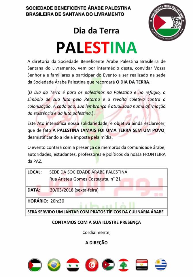 يذكر أن عدة جمعيات ومؤسسات عربية وفلسطينية مختلفة في البرازيل بإحياء يوم الأرض الفلسطيني في 30 مارس/آذار من كل عام، أسوة بالعديد من الجمعيات والمؤسسات والفعاليات الفلسطينية في العالم.