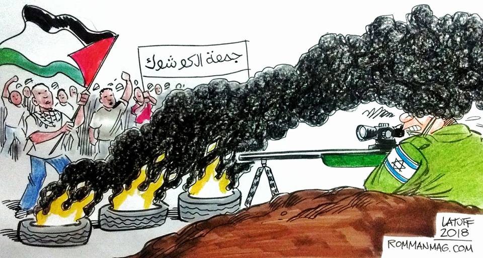 كاريكاتير للرسام البرازيلي كارلوس لطوف يتناول "جمعة الكوشوك" إحدى فعاليات مسيرة العودة الكبرى بالتزامن مع ذكرى النكبة.