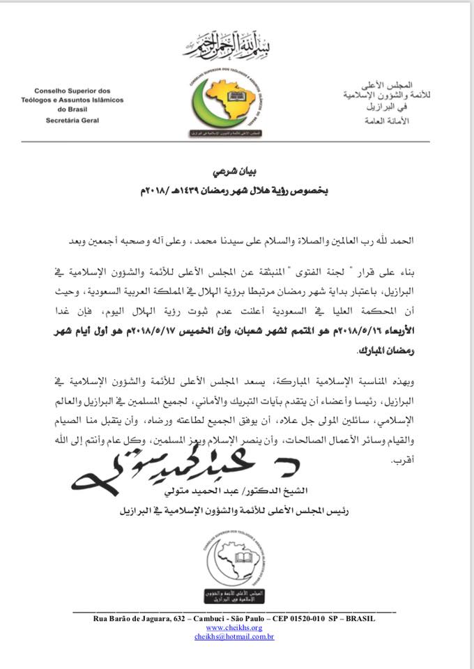 أعلنت الأمانة العامة للمجلس الأعلى للأئمة والشؤون الإسلامية في البرازيل في بيان شرعي أصدرته اليوم بخصوص رؤية هلال شهر رمضان 1439 هـ/2018م، أن يوم الخميس الموافق لـ 17/05/2018 هو أول أيام شهر رمضان المبارك في البرازيل.
