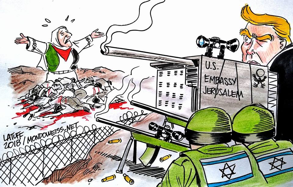 كاريكاتير للرسام البرازيلي كارلوس لطوف حول افتتاح السفارة الأمريكية في القدس المحتلة وقتل عشرات الفلسطينيين على أيدي قوات الاحتلال "الإسرائيلي"