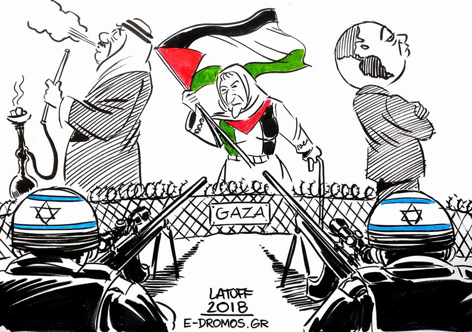 كاريكاتير للرسام البرازيلي كارلوس لطوف حول المذبحة التي تتعرض لها غزة في الذكرى السبعين للنكبة وسط صمت دولي وعربي