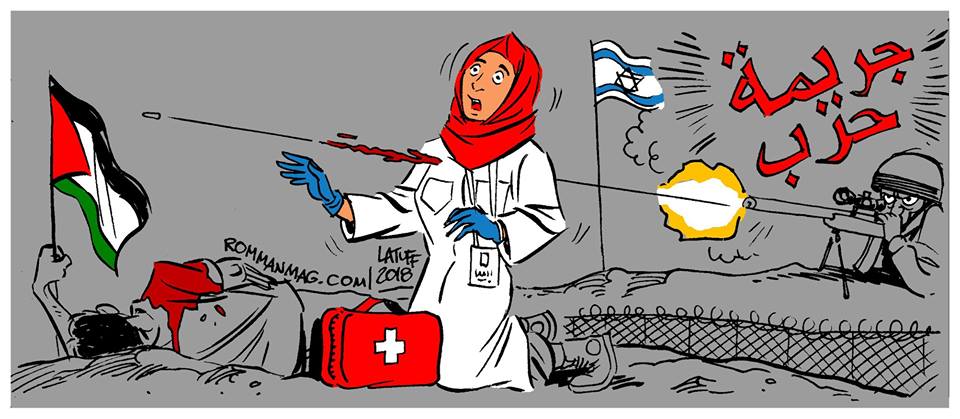 كاريكاتير للرسام البرازيلي كارلوس لطوف حول جريمة الحرب التي ارتكبها جيش الاحتلال "الإسرائيلي" بحق المسعفة رزان النجار على حدود قطاع غزة