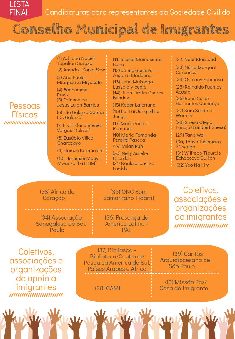 أعلن المجلس البلدي لمدينة ساو باولو مؤخراً عن قائمة من المرشحين لانتخابات "المجلس البلدي للمهاجرين". وهو مجلس مؤلف من ممثلين عن المهاجرين واللاجئين في مدينة ساو باولو ويضم أيضاً ممثلين لمنظمات غير حكومية وجهات أخرى تمثل المهاجرين واللاجئين أو داعمة لهم في مدينة ساو باولو.