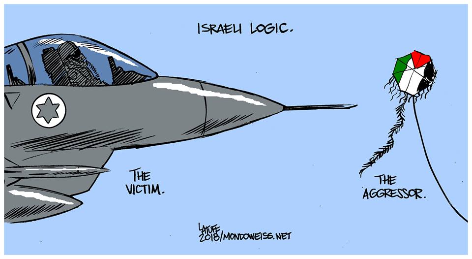 كاريكاتير للرسام البرازيلي كارلوس لطوف حول نجاح الطائرات الورقية الفلسطينية في تعطيل عدوان سلاح الجو "الإسرائيلي"