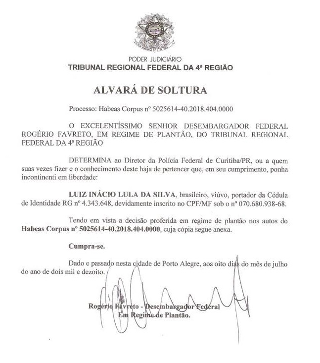 أصدرت المحكمة الإقليمية الفيدرالية الرابعة في البرازيل برئاسة القاضي البرازيلي «روجيرو فافريتو» أمراً قضائياً يقضي بإطلاق سراح الرئيس البرازيلي الأسبق «لويس اناسيو لولا دا سيلفا»، بعد مرور ثلاثة أشهر على احتجازه على خلفية توجيه تهم له، تتعلق بقضايا فساد مورست أثناء فترة حكمه والفترة التي تلتها بحكم الرئيسة العمالية «ديلما روسيف» ضمن ما يعرف بعملية "لافا جاتو Lava jato".