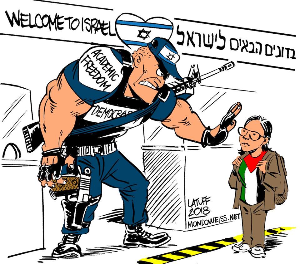 كاريكاتير للرسام البرازيلي كارلوس لطوف حول منع الطالبة الفلسطينية لارا القاسم من متابعة تحصيلها الأكاديمي