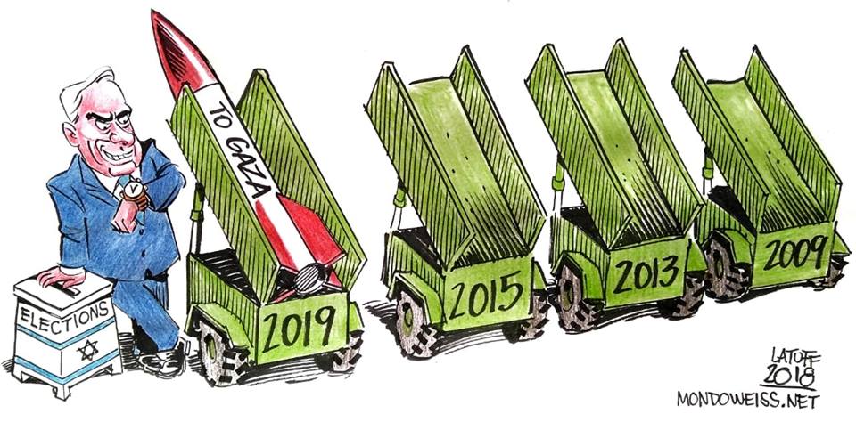 كاريكاتير للرسام البرازيلي كارلوس لطوف حول استخدام المجازر والحروب ضد الفلسطينيين كمادة للدعاية في الانتخابات "الإسرائيلية"