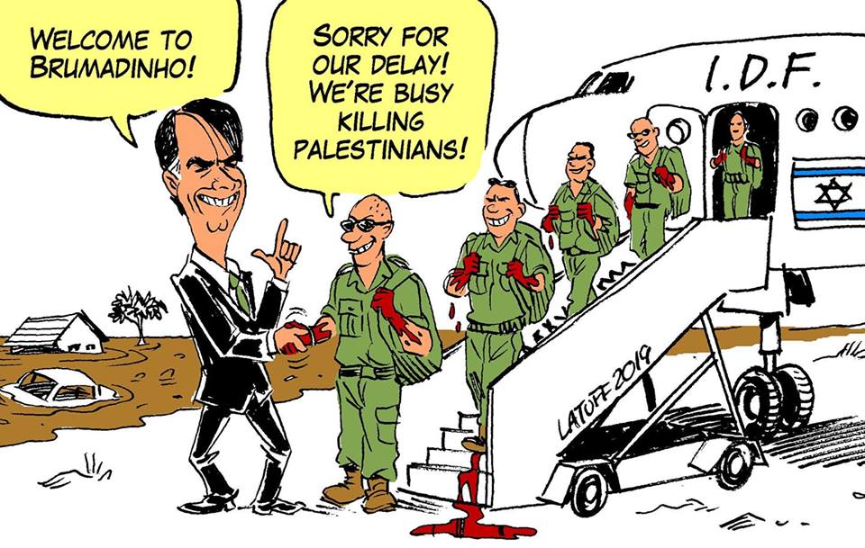كاريكاتير للرسام البرازيلي كارلوس لطوف حول مشاركة جنود الاحتلال "الإسرائيلي" في عملية إنقاذ ضحايا انهيار سد في البرازيل بعد أن استكملوا عملية قتل الفلسطينيين