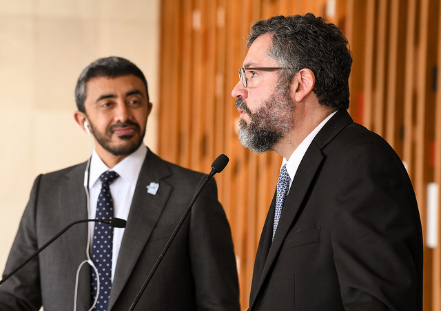 قام  وزير الخارجية والتعاون الدولي في دولة الإمارات العربية المتحدة، الشيخ «عبد الله بن زايد» بزيارة إلى البرازيل اليوم الجمعة 15 مارس/آذار، بهدف تعزيز التعاون بين دولة الإمارات العربية المتحدة وجمهورية البرازيل الاتحادية. التقى خلالها بكلٍ من الرئيس «جايير بولسونارو» وبوزير الشؤون الخارجية البرازيلي «إرنستو آراوجو».