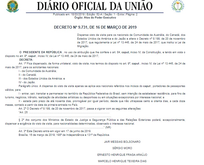 أصدر الرئيس البرازيلي جايير بولسونارو مرسوماً أعفى بموجبه السياح من الولايات المتحدة الأمريكية وكندا واليابان وأسترالي من ضرورة الحصول على التأشيرة السياحية لزيارة البرازيل. وقد تم نشر هذا المرسوم في ملحق العدد الصارد أمس الاثنين من الجريدة الرسمية. ومن اللافت أن بولسونارو قد وقّع هذا المرسوم أثناء زيارة الدولة التي يقوم بها إلى الولايات المتحدة حيث يلتقي بالرئيس الأمريكي دونالد ترامب اليوم الثلاثاء.
