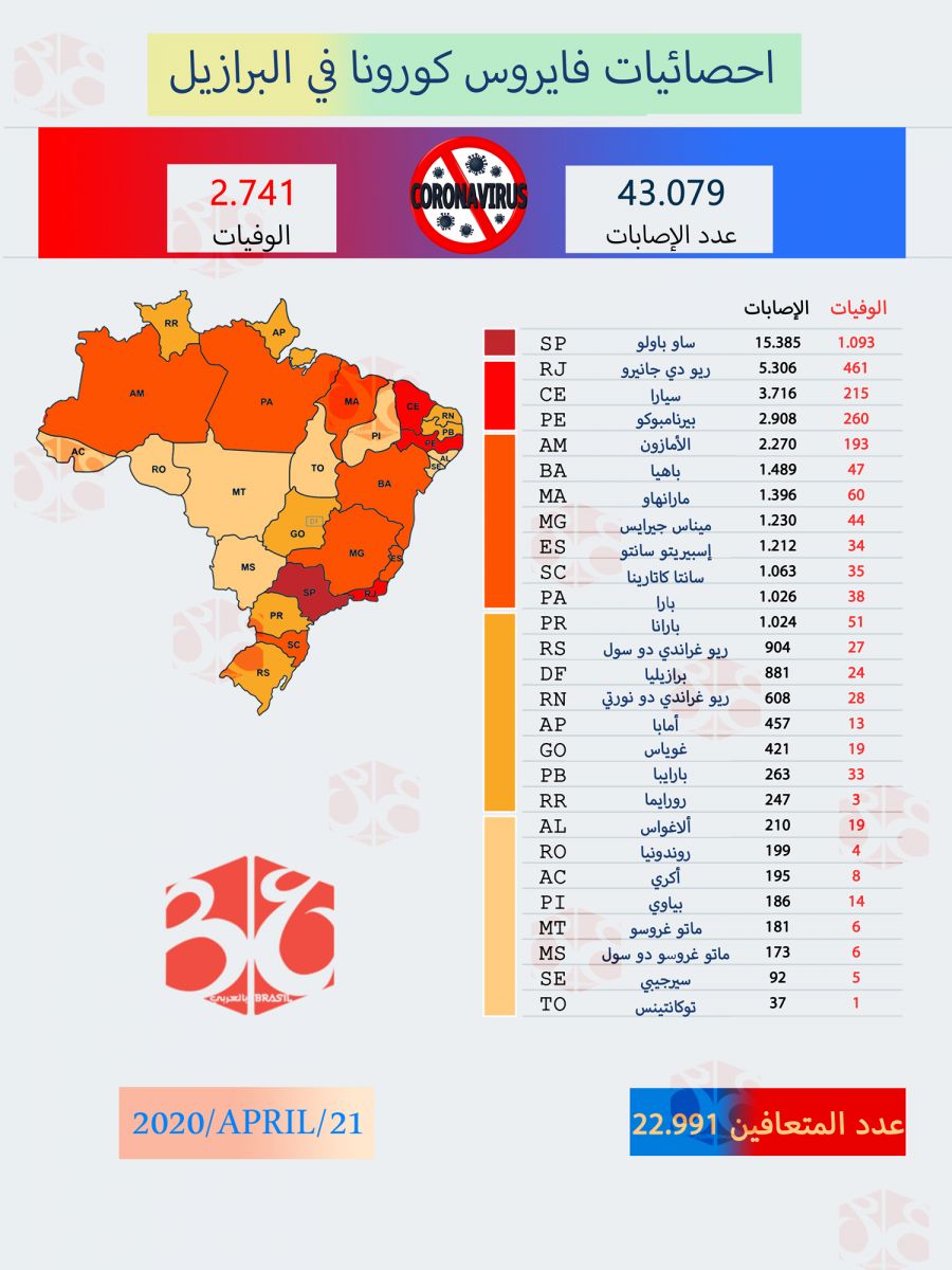 كما أن وزير الصحة البرازيلي السيد تايتش يعلن عن شراء 40 مليون فحص طبي لفيروس كورونا، فيما تعلن وزارة الصحة عن مايزيد 800 حالة شفاء جديدة لتصل البرازيل لنسبة شفاء 53% من عدد الحالات الاجمالي.