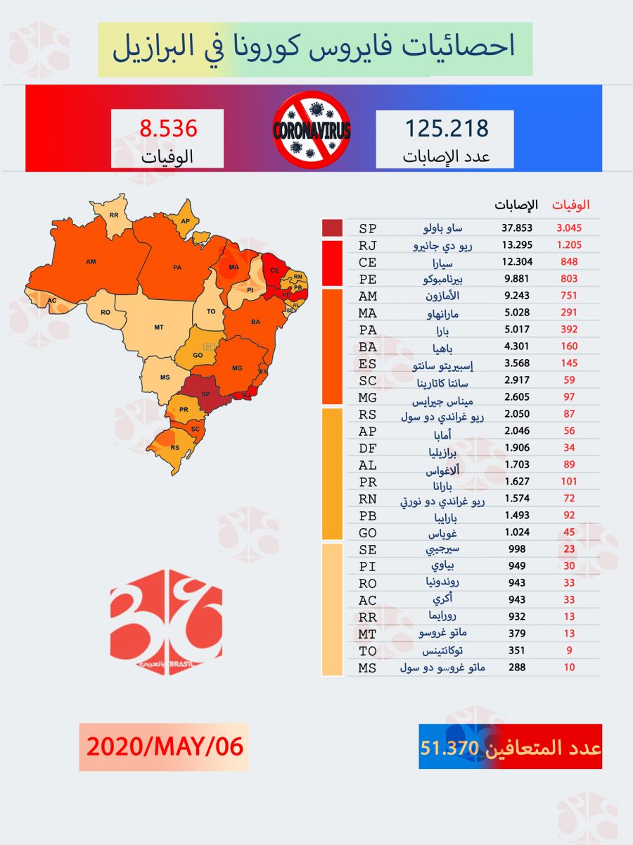 تسجل البرازيل 10503 إصابة جديدة و 615 حالة وفاة بفيروس كورونا اليوم 6مايو/أبريل الجاري.