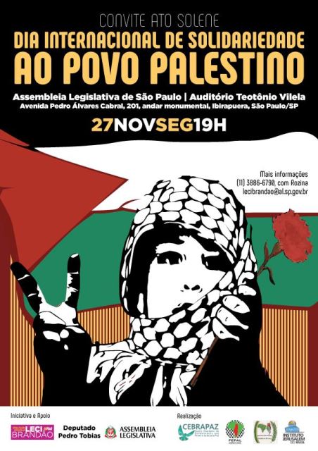 وتقام عدة نشاطات تضامنية برازيلية مع الشعب الفلسطيني هذا العام، لعل أبرزها، الدعوة الرسمية التي أعلن عنها برلمان ولاية ساو باولو بالتنسيق مع عدة جهات عربية وفلسطينية وأحزاب برازيلية لإحياء نشاط رسمي في قاعات برلمان الولاية، يقام يوم الاثنين 27 تشرين الثاني/نوفمبر في الساعة السابعة مساء.