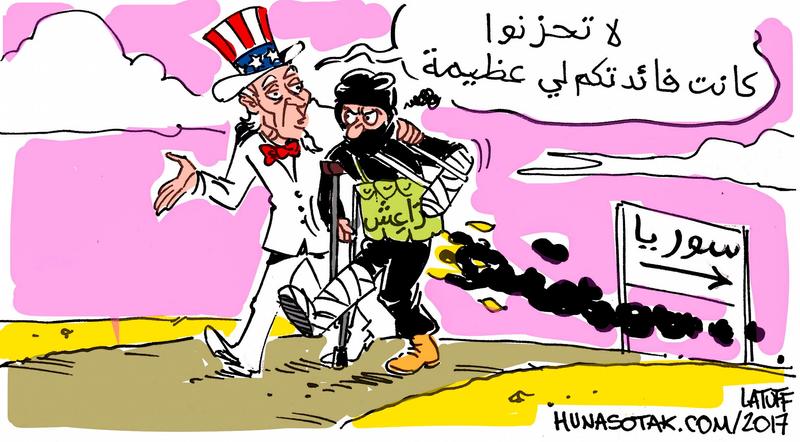 العلاقة بين الولايات المتحدة الأمريكية وداعش في كاريكاتير للرسام البرازيلي كارلوس لطوف