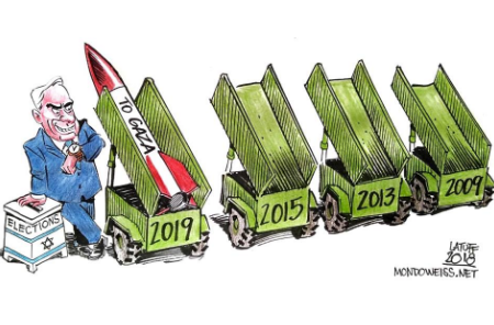 كاريكاتير للرسام البرازيلي كارلوس لطوف حول استخدام المجازر والحروب ضد الفلسطينيين كمادة للدعاية في الانتخابات "الإسرائيلية"