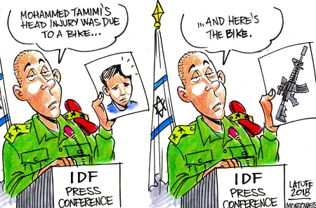كاريكاتير للرسام البرازيلي كارلوس لطوف يتناول تبرير الاحتلال لجريمته بحق الطفل محمد التميمي