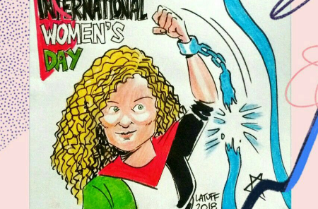 ملصق للرسام البرازيلي كارلوس لطوف يدعم نضال الأسيرة عهد التميمي في يوم المرأة العالمي