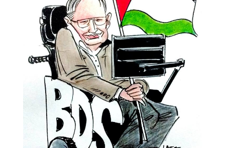 كاريكاتير للرسام البرازيلي كارلوس لطوف يظهر تضامن العالم البريطاني الراحل ستفين هوكنغ مع حركة المقاطعة ودعم فلسطين