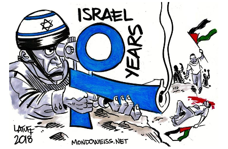كاريكاتير للرسام البرازيلي كارلوس لطوف يتناول 70 عاماً من الاحتلال الاستيطاني الصهيوني في فلسطين