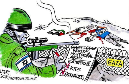 كاريكاتير للرسام البرازيلي كارلوس لطوف حول استهداف قوات جيش الاحتلال "الإسرائيلي" للصحافيين والأطفال.