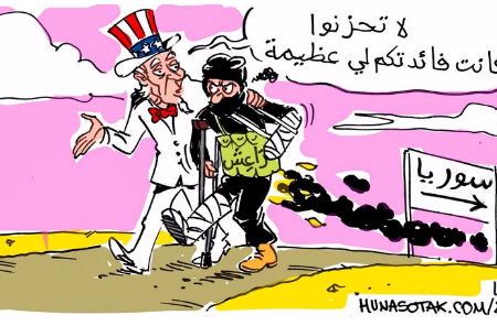 العلاقة بين الولايات المتحدة الأمريكية وداعش في كاريكاتير للرسام البرازيلي كارلوس لطوف